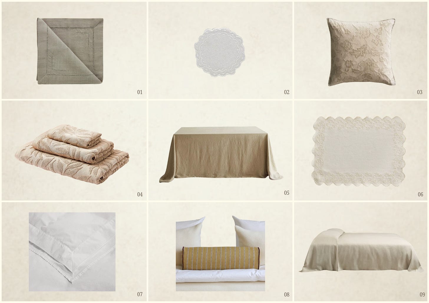 I’ve always loved delicate textile details in a home. Linen tablecloths, lace edges on pillowcases, embroidered napkins, placemats or a soft tablecloth instantly add a sense of depth to a room, especially in interiors that lean towards muted or earthy tones.