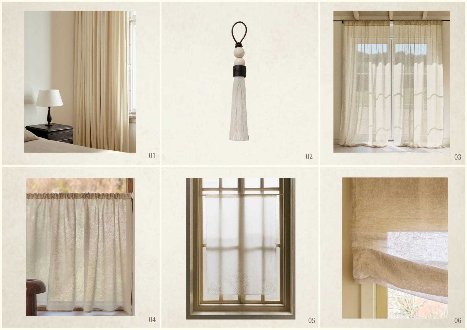 I particularly love the combination of long curtains with a Roman blind behind them. Lately, I find myself drawn to curtains with a pleated detail, hung on an iron pole and gently held in place with a tassel - paired with a Roman blind with a soft, relaxed wave. It feels incredibly elegant and intentional.
