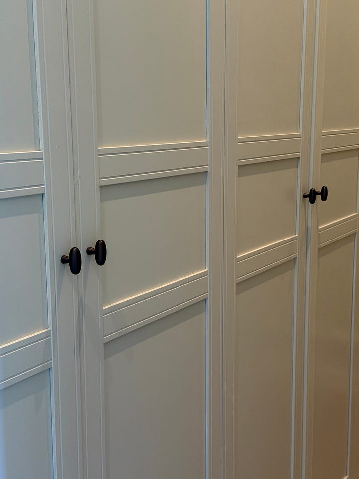 The same cabinet looks completely different depending on what you put on it. A large brass knob on a simple cabinet makes the whole kitchen feel grounded. A slim, minimal pull tells a completely different story. Neither is wrong - but seeing them side by side made me understand that the relationship between the hardware and the surface is where the whole feeling lives.