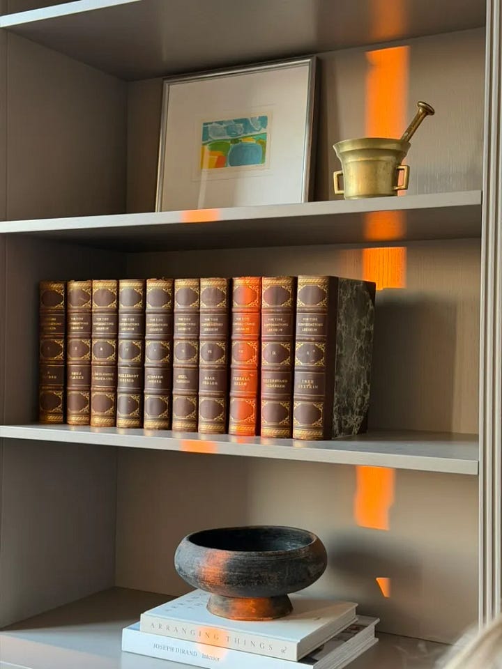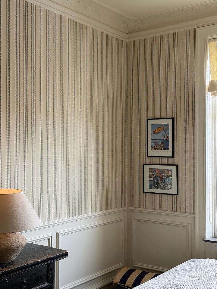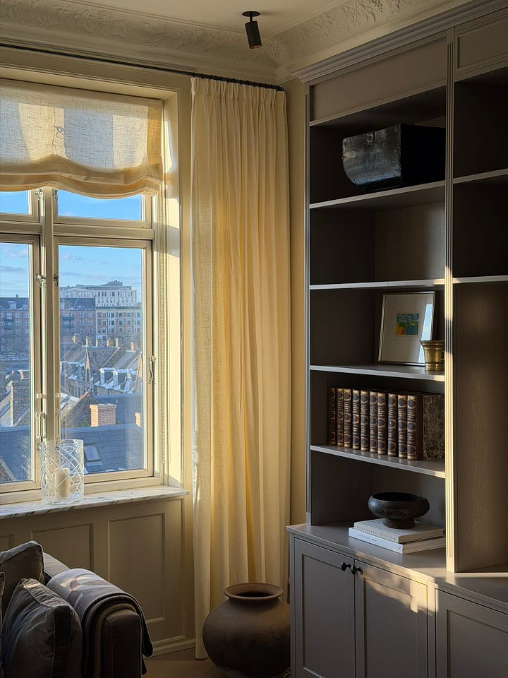 In this home, texture plays a larger role. Details matter more. Curtain poles are chosen carefully. Pleats are soft rather than strict. Roman blinds are gently shaped instead of perfectly straight. Trim has been added to otherwise plain walls. Wallpaper appears in selected rooms, not everywhere, but where it can create depth. A built-in bookshelf was designed not just for storage, but for styling - layering vintage objects collected over time.